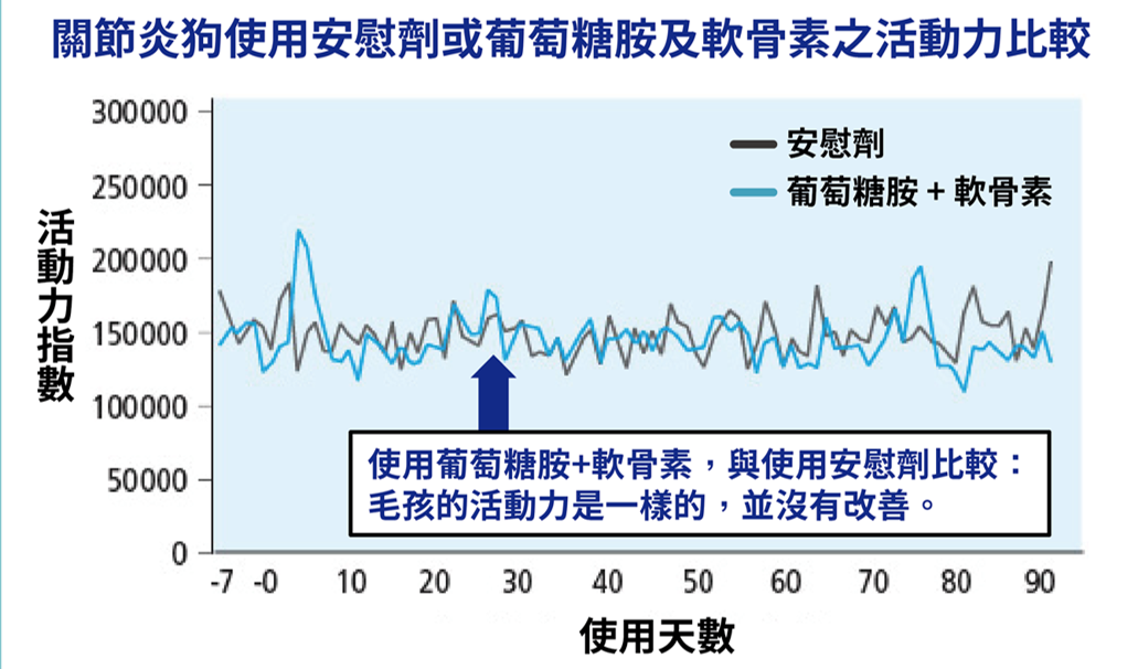 使用葡萄糖胺與軟骨素,相當於使用安慰劑!另外一篇研究發現,狗狗吃葡萄糖胺只有12%的生物利用率、軟骨素更只有5%...