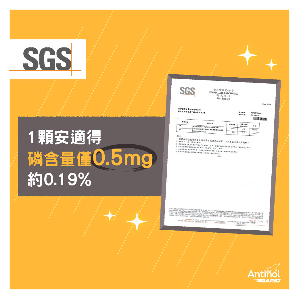 每顆安適得磷含量僅0.5mg,約0.19%。